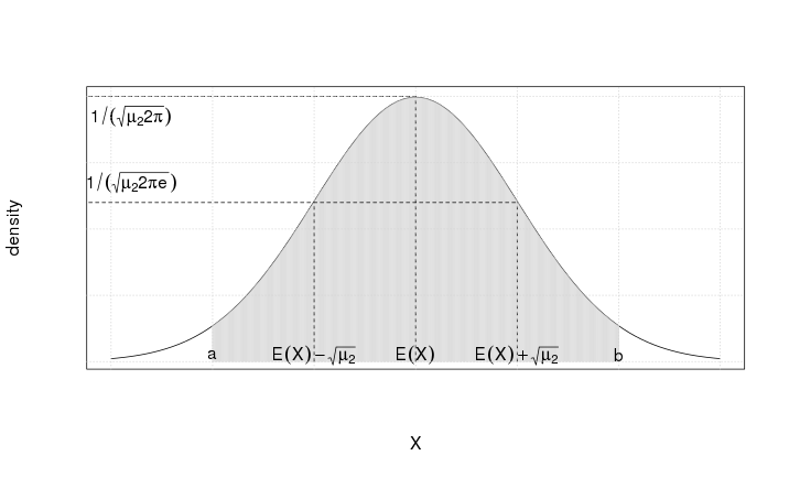 \[ \forall a \leq b: \text{P}(a \leq X \leq b) = \int_{a}^{b} \frac 1{\sqrt{2 \pi \mu_2}}e^{-\frac 1 2\left[\frac{X-\text{E}(X)}{\sqrt{\mu_2}}\right]^2}\text{d}X \]