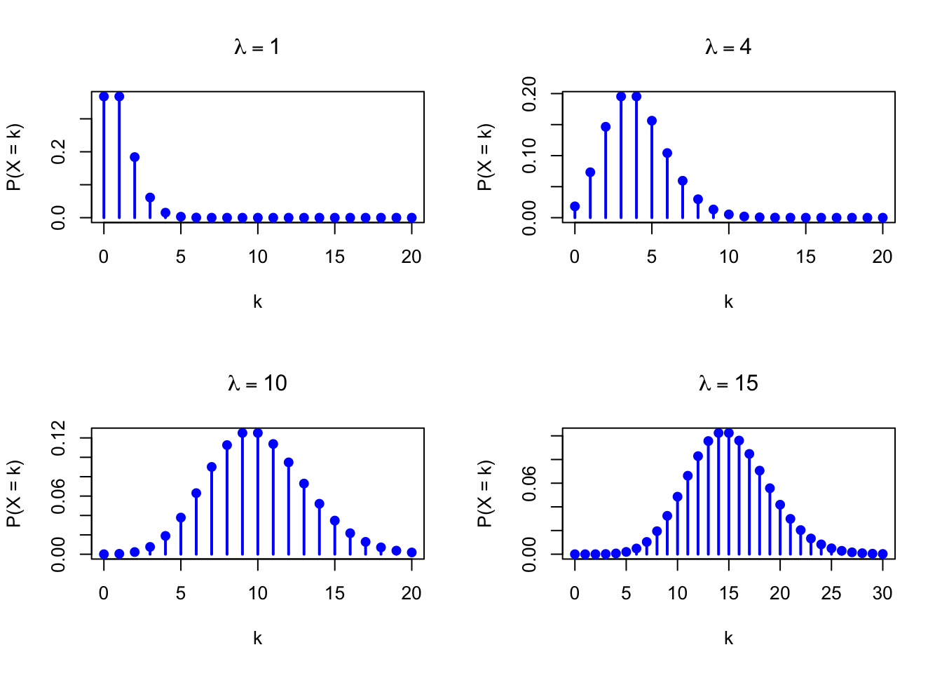 par(mfrow =c(2, 2))x <-0:20# Lambda = 1plot(x, dpois(x, lambda =1), type ="h", lwd =2, col ="blue",xlab ="k", ylab ="P(X = k)", main =expression(lambda ==1))points(x, dpois(x, lambda =1), pch =19, col ="blue")# Lambda = 4plot(x, dpois(x, lambda =4), type ="h", lwd =2, col ="blue",xlab ="k", ylab ="P(X = k)", main =expression(lambda ==4))points(x, dpois(x, lambda =4), pch =19, col ="blue")# Lambda = 10plot(x, dpois(x, lambda =10), type ="h", lwd =2, col ="blue",xlab ="k", ylab ="P(X = k)", main =expression(lambda ==10))points(x, dpois(x, lambda =10), pch =19, col ="blue")# Lambda = 15x <-0:30plot(x, dpois(x, lambda =15), type ="h", lwd =2, col ="blue",xlab ="k", ylab ="P(X = k)", main =expression(lambda ==15))points(x, dpois(x, lambda =15), pch =19, col ="blue")par(mfrow =c(1, 1))