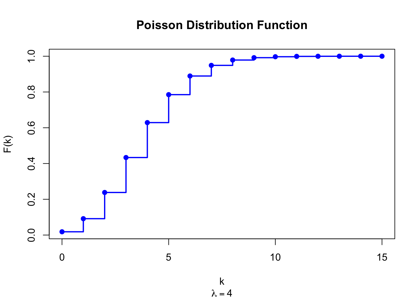 x <-0:15plot(x, ppois(x, lambda =4), type ="s", lwd =2, col ="blue",xlab ="k", ylab ="F(k)", main ="Poisson Distribution Function",sub =expression(lambda ==4))points(x, ppois(x, lambda =4), pch =19, col ="blue")