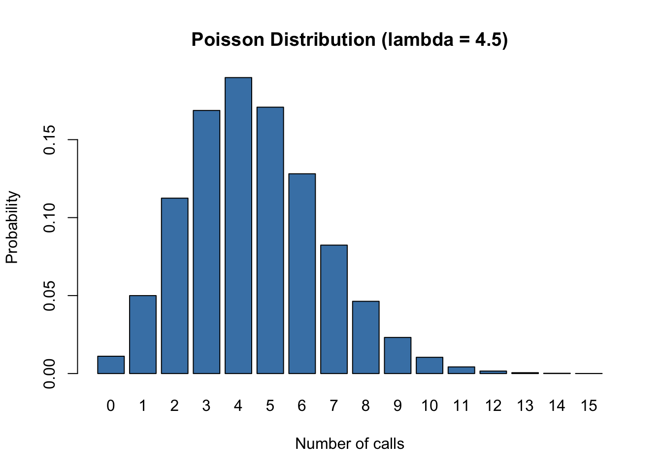 x <-0:15probs <-dpois(x, lambda =4.5)barplot(probs, names.arg = x, col ="steelblue",xlab ="Number of calls", ylab ="Probability",main ="Poisson Distribution (lambda = 4.5)")