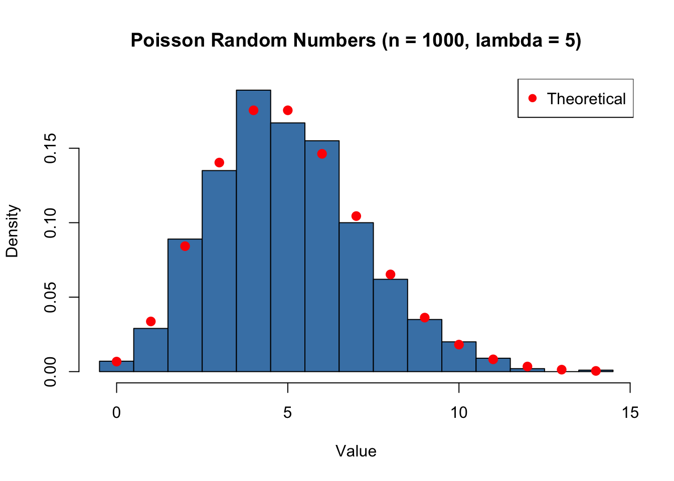 Random numbers from a Poisson distribution can be generated using the rpois function: