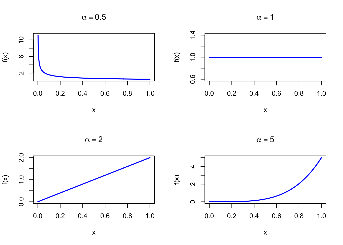 par(mfrow =c(2, 2))x <-seq(0, 1, length =500)plot(x, dbeta(x, shape1 =0.5, shape2 =1), type ="l", lwd =2, col ="blue",xlab ="x", ylab ="f(x)", main =expression(alpha ==0.5))plot(x, dbeta(x, shape1 =1, shape2 =1), type ="l", lwd =2, col ="blue",xlab ="x", ylab ="f(x)", main =expression(alpha ==1))plot(x, dbeta(x, shape1 =2, shape2 =1), type ="l", lwd =2, col ="blue",xlab ="x", ylab ="f(x)", main =expression(alpha ==2))plot(x, dbeta(x, shape1 =5, shape2 =1), type ="l", lwd =2, col ="blue",xlab ="x", ylab ="f(x)", main =expression(alpha ==5))par(mfrow =c(1, 1))