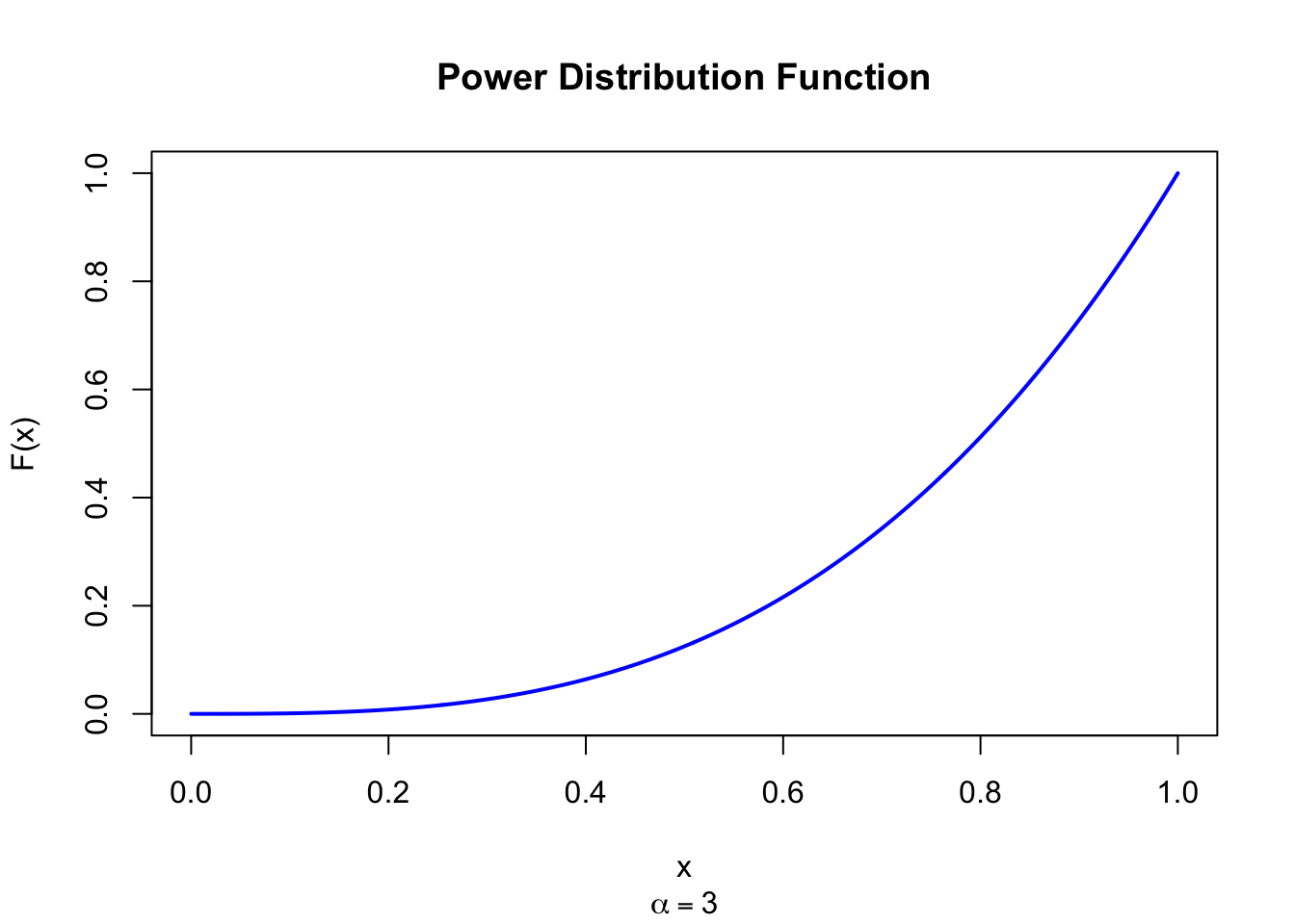 x <-seq(0, 1, length =500)plot(x, pbeta(x, shape1 =3, shape2 =1), type ="l", lwd =2, col ="blue",xlab ="x", ylab ="F(x)", main ="Power Distribution Function",sub =expression(alpha ==3))
