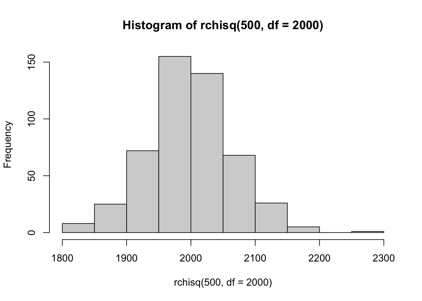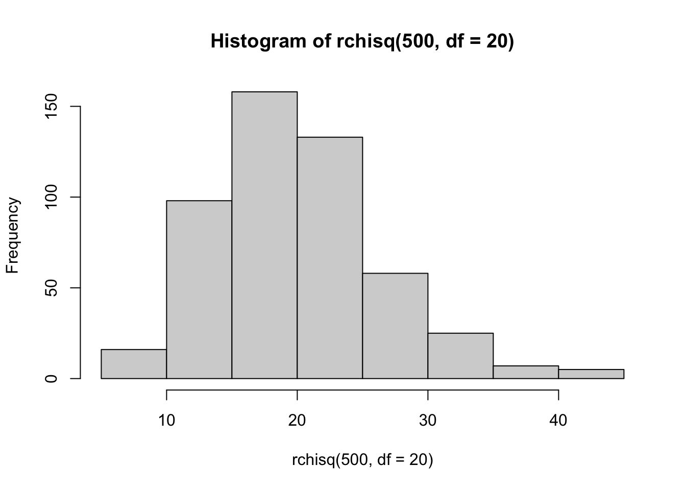 The computation shows that the estimated degrees of freedom is very close to 1 (i.e. the theoretical value). In addition, the Histogram shows that the Chi-squared density function fits the data well.