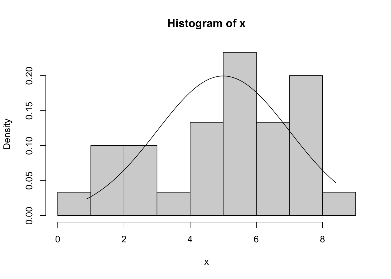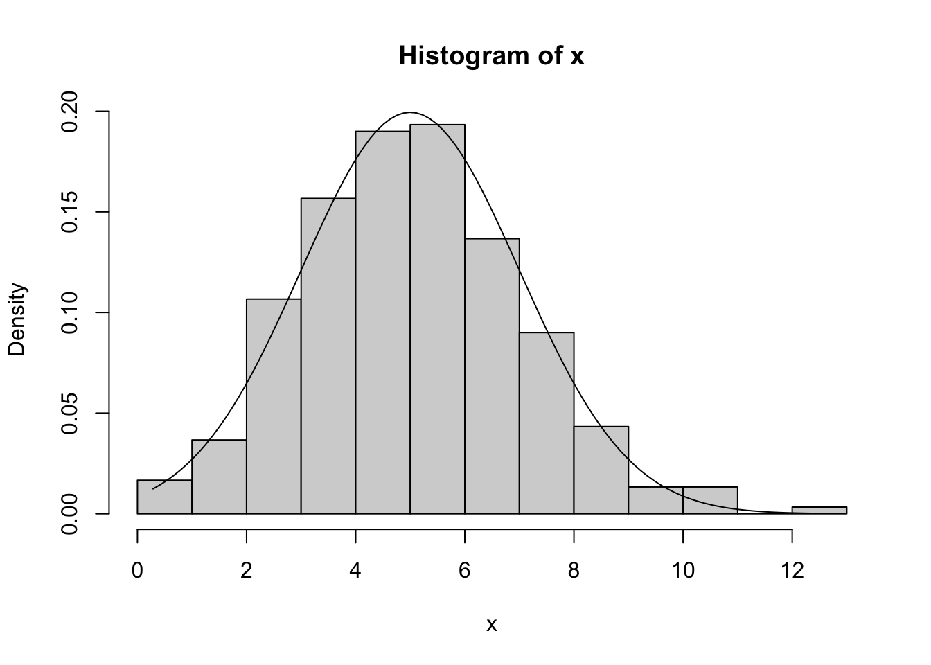 x =rnorm(300, mean = mymean, sd = mysd)myhist<-hist(x, freq=F)curve(1/(mysd*sqrt(2*pi))*exp(-1/2*((x-mymean)/mysd)^2), min(x), max(x), add=T)