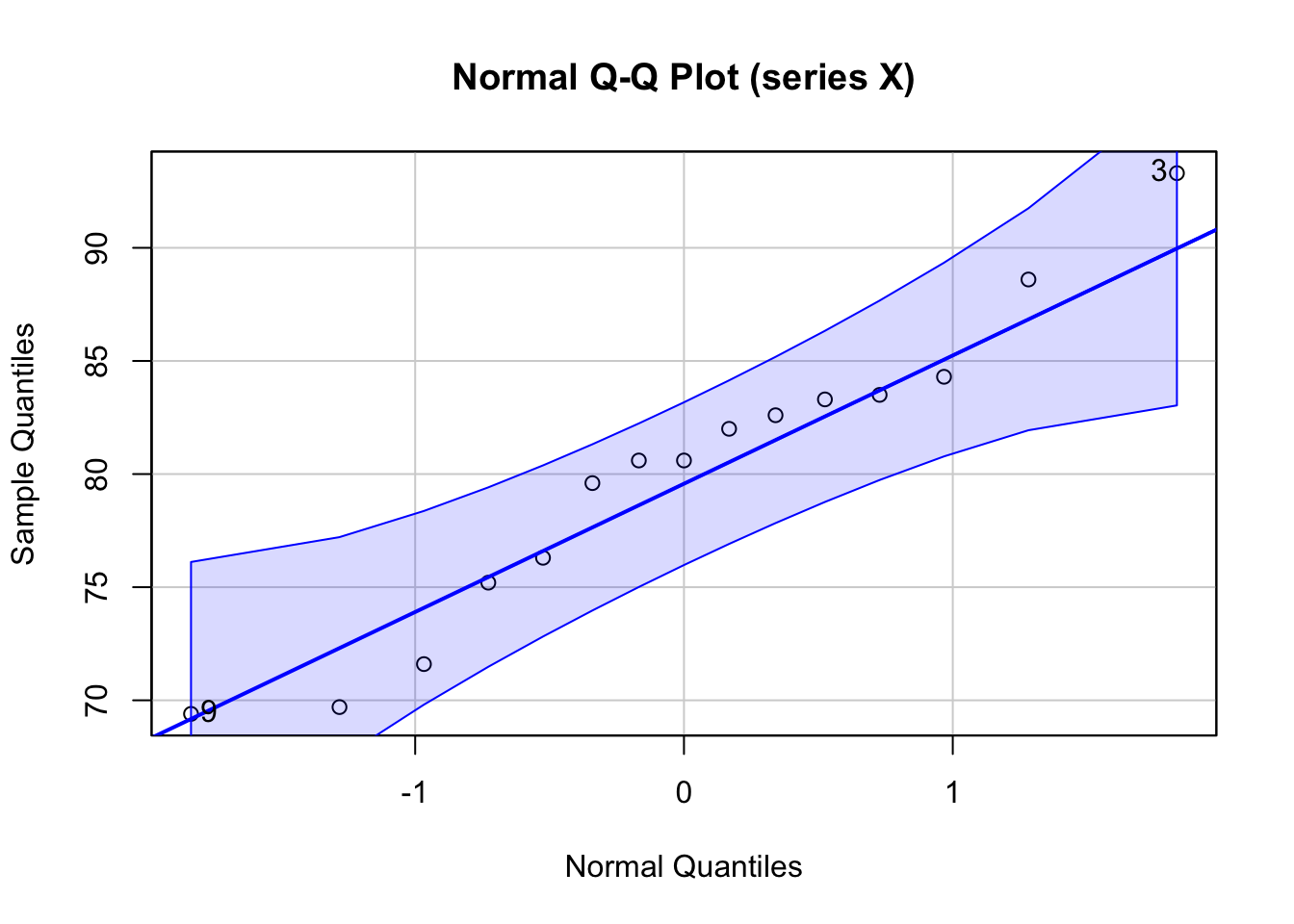 The analysis shows the Normal QQ Plot with confidence intervals. There are many points which fall outside the confidence intervals -- this is an indication that the time series is not normally distributed.