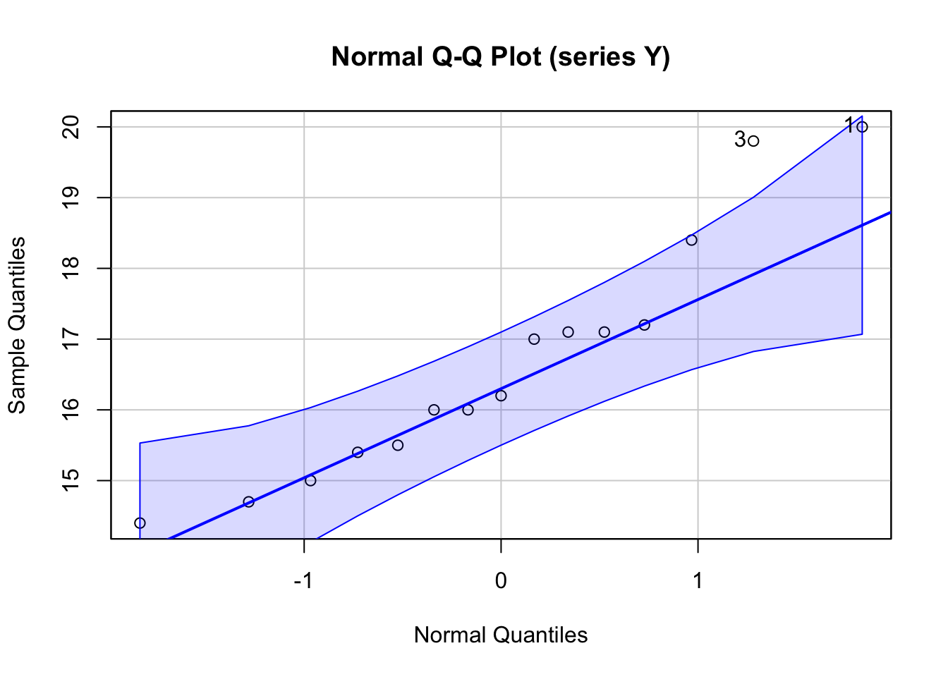 Note that the Normal QQ Plot can be obtained through the base R qqplot function but this is not recommended. Instead, it is better to use the qqPlot function from the car package because it computes the confidence intervals.