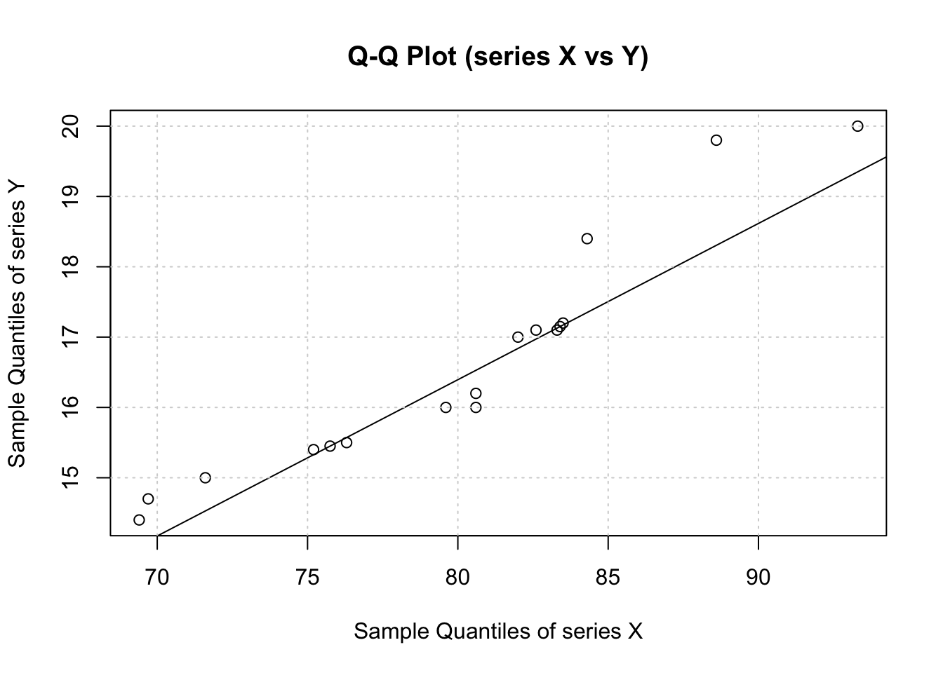 the distributions of both series \(x\) and \(y\) are compared by drawing a scatter plot (see Chapter 70) of their respective Quantiles (the sample sizes do not have to be equal)