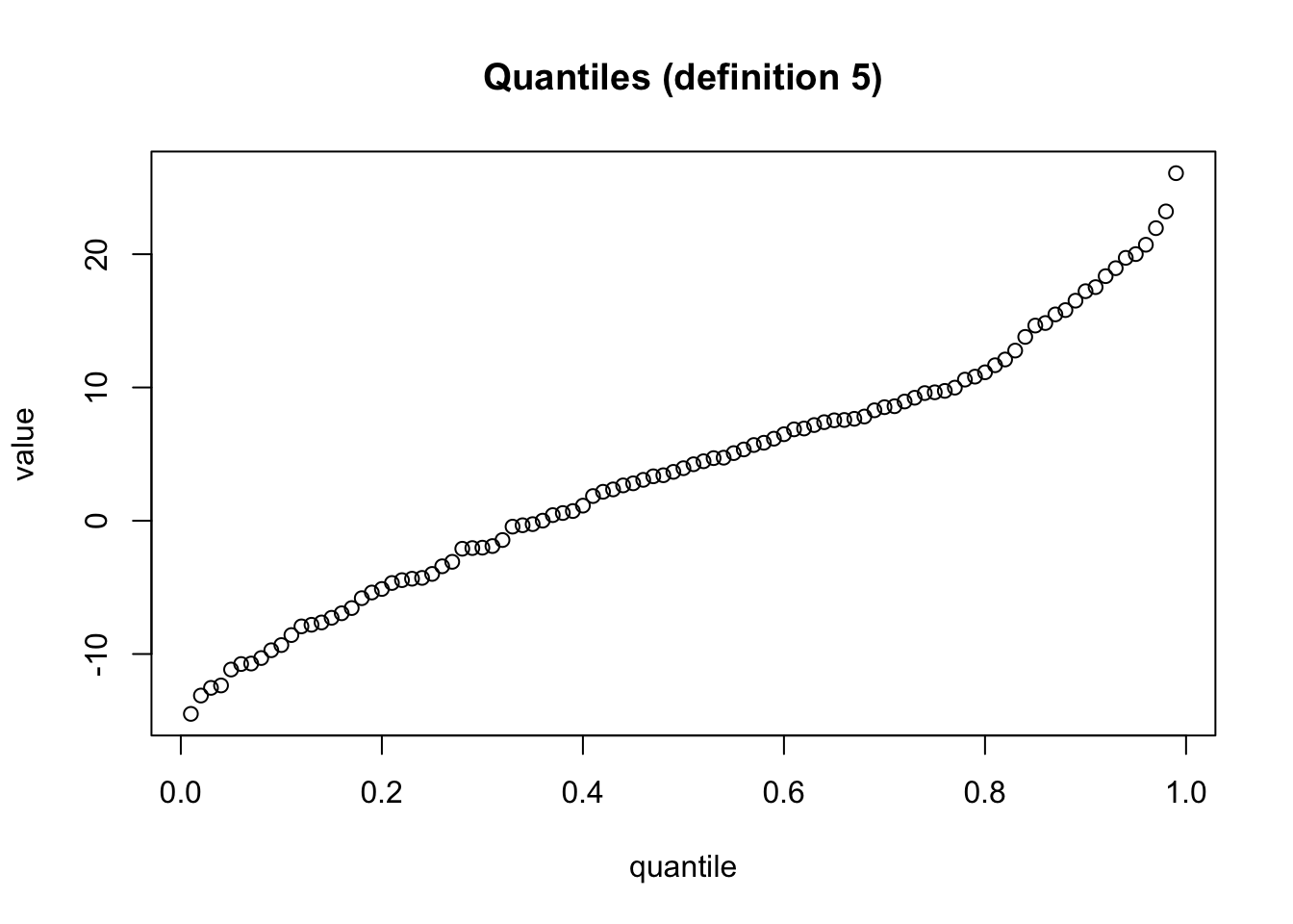 plot(rownames(mydf), mydf[,5], xlab = "quantile", ylab = "value", main = "Quantiles (definition 5)")