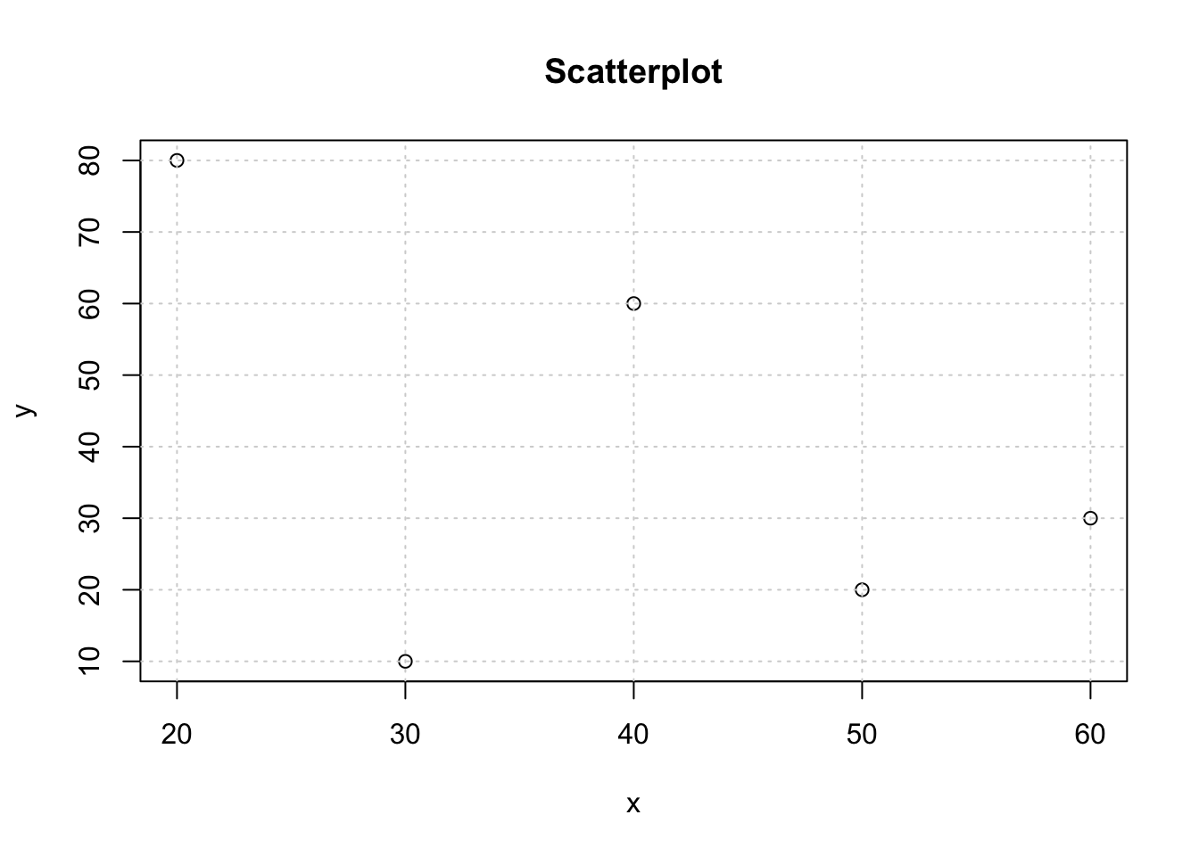 y <-c(80,60,10,20,30)x <-c(20,40,30,50,60)ylab ='y'xlab ='x'plot(x,y,main='Scatterplot',xlab=xlab,ylab=ylab)grid()