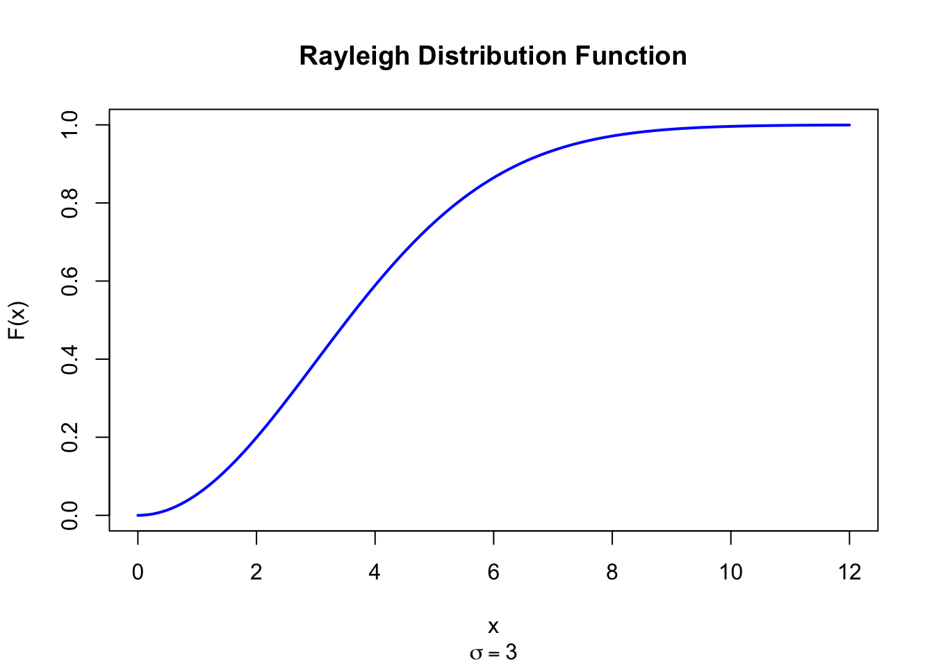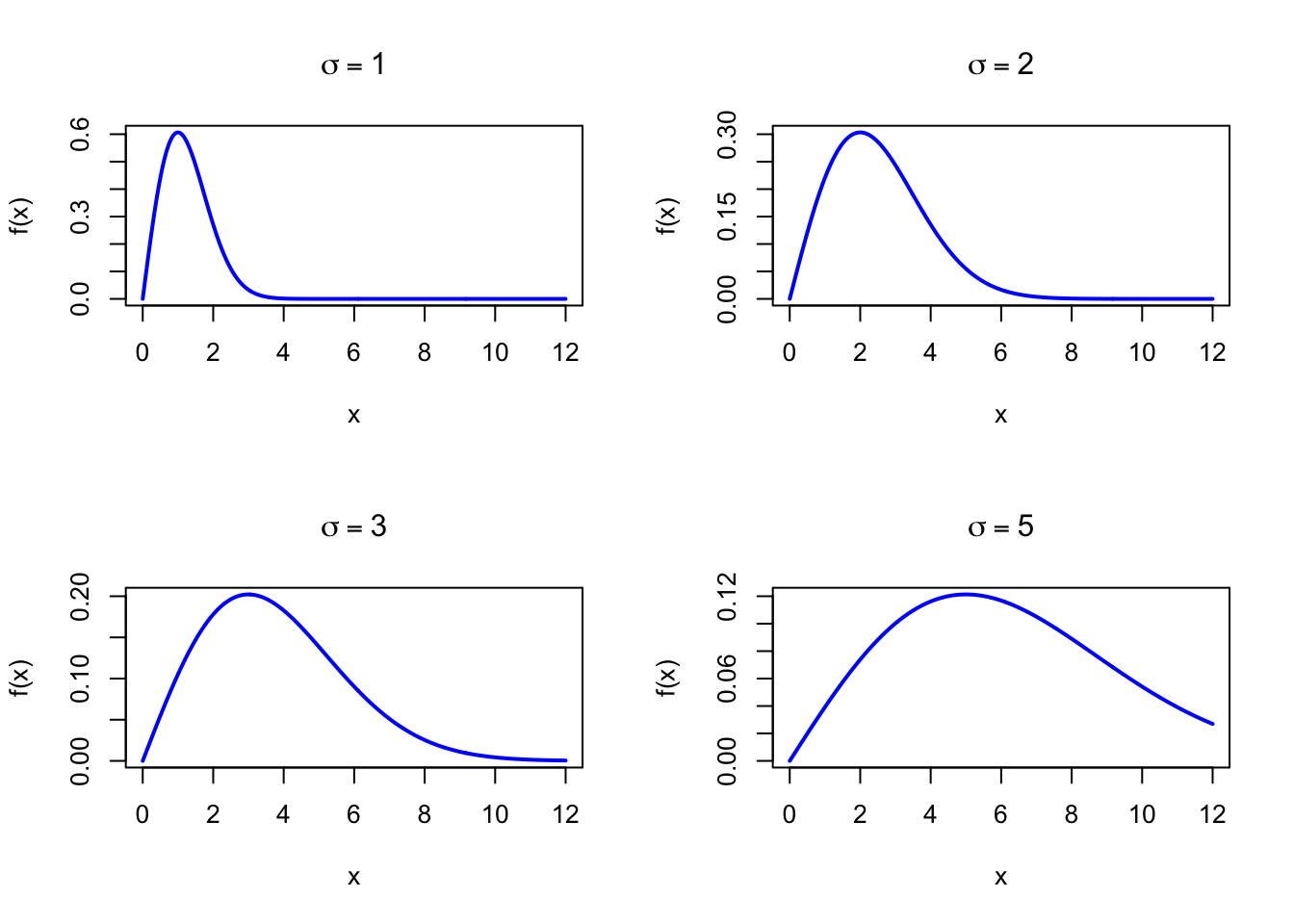drayleigh <-function(x, sigma) {ifelse(x >=0, x / sigma^2*exp(-x^2/ (2* sigma^2)), 0)}par(mfrow =c(2, 2))x <-seq(0, 12, length =500)plot(x, drayleigh(x, 1), type ="l", lwd =2, col ="blue",xlab ="x", ylab ="f(x)", main =expression(sigma ==1))plot(x, drayleigh(x, 2), type ="l", lwd =2, col ="blue",xlab ="x", ylab ="f(x)", main =expression(sigma ==2))plot(x, drayleigh(x, 3), type ="l", lwd =2, col ="blue",xlab ="x", ylab ="f(x)", main =expression(sigma ==3))plot(x, drayleigh(x, 5), type ="l", lwd =2, col ="blue",xlab ="x", ylab ="f(x)", main =expression(sigma ==5))par(mfrow =c(1, 1))