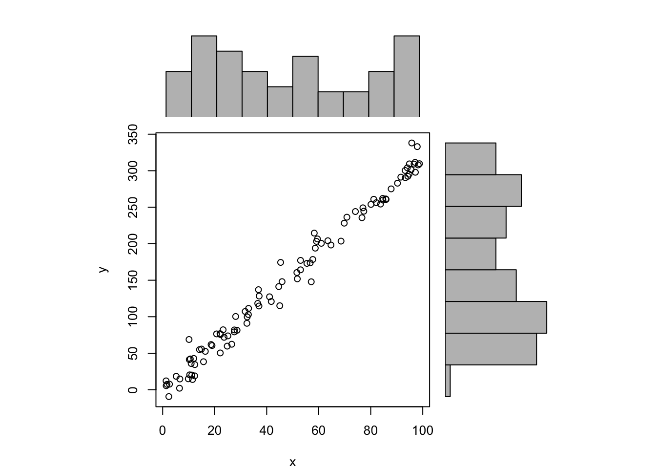 x <-runif(n =100, min =1, max =100)y <-3.2*x +rnorm(n =100, mean =0, sd =12)ylab ='y'xlab ='x'main ='Scatterplot and histograms'histx <-hist(x, plot=FALSE)histy <-hist(y, plot=FALSE)maxcounts <-max(c(histx$counts, histy$counts))xrange <-c(min(x),max(x))yrange <-c(min(y),max(y))nf <-layout(matrix(c(2,0,1,3),2,2,byrow=TRUE), c(3,1), c(1,3), TRUE)par(mar=c(4,4,1,1))plot(x, y, xlim=xrange, ylim=yrange, xlab=xlab, ylab=ylab, sub=main)par(mar=c(0,4,1,1))barplot(histx$counts, axes=FALSE, ylim=c(0, maxcounts), space=0)par(mar=c(4,0,1,1))barplot(histy$counts, axes=FALSE, xlim=c(0, maxcounts), space=0, horiz=TRUE)