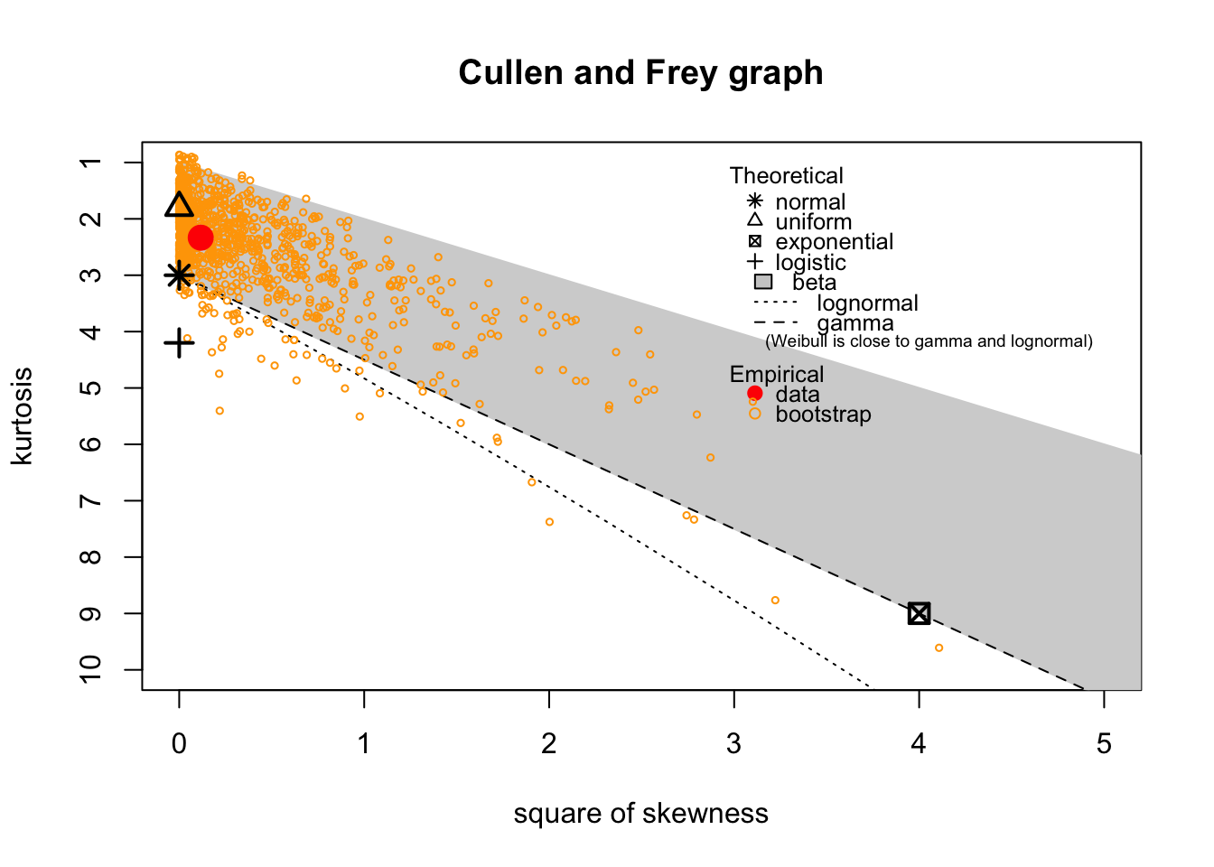 To compute the Skewness–Kurtosis Plot, the R code uses two functions from the fitdistrplus library: plotdist and descdist. The Skewness–Kurtosis Plot is also known as the Cullen and Frey graph (Cullen and Frey 1999).