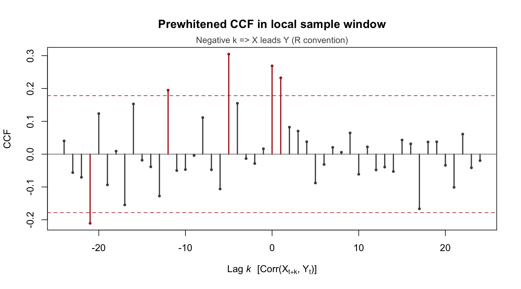 Inspect the prewhitened CCF: identify a meaningful lead at approximately k = -5 (R convention: negative lag means X leads Y).