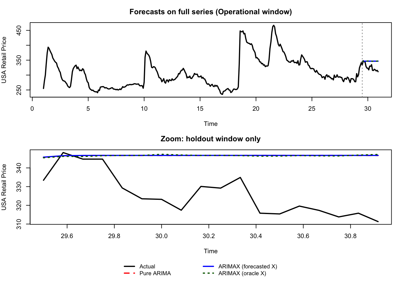 In this stress-test, the gap between ARIMAX (oracle X) and ARIMAX (forecasted X) mainly measures information loss from not observing future Colombia. This is a pedagogical upper-bound check, not the default production setting.
