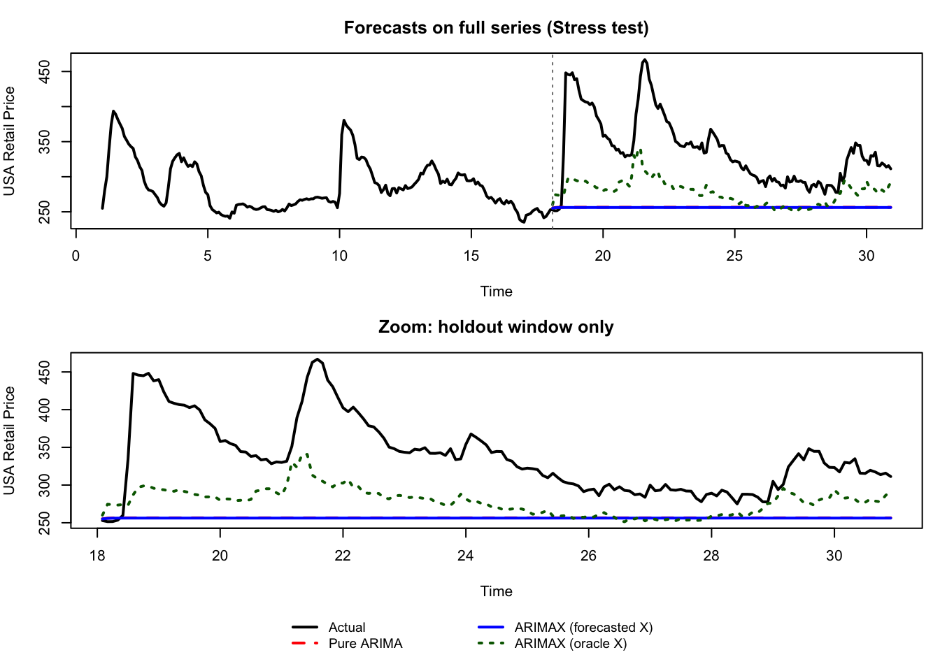 Figure 156.4: Stress-test forecasting experiment (cutoff = 18.0): pure ARIMA, ARIMAX with forecasted input, and ARIMAX with oracle input.