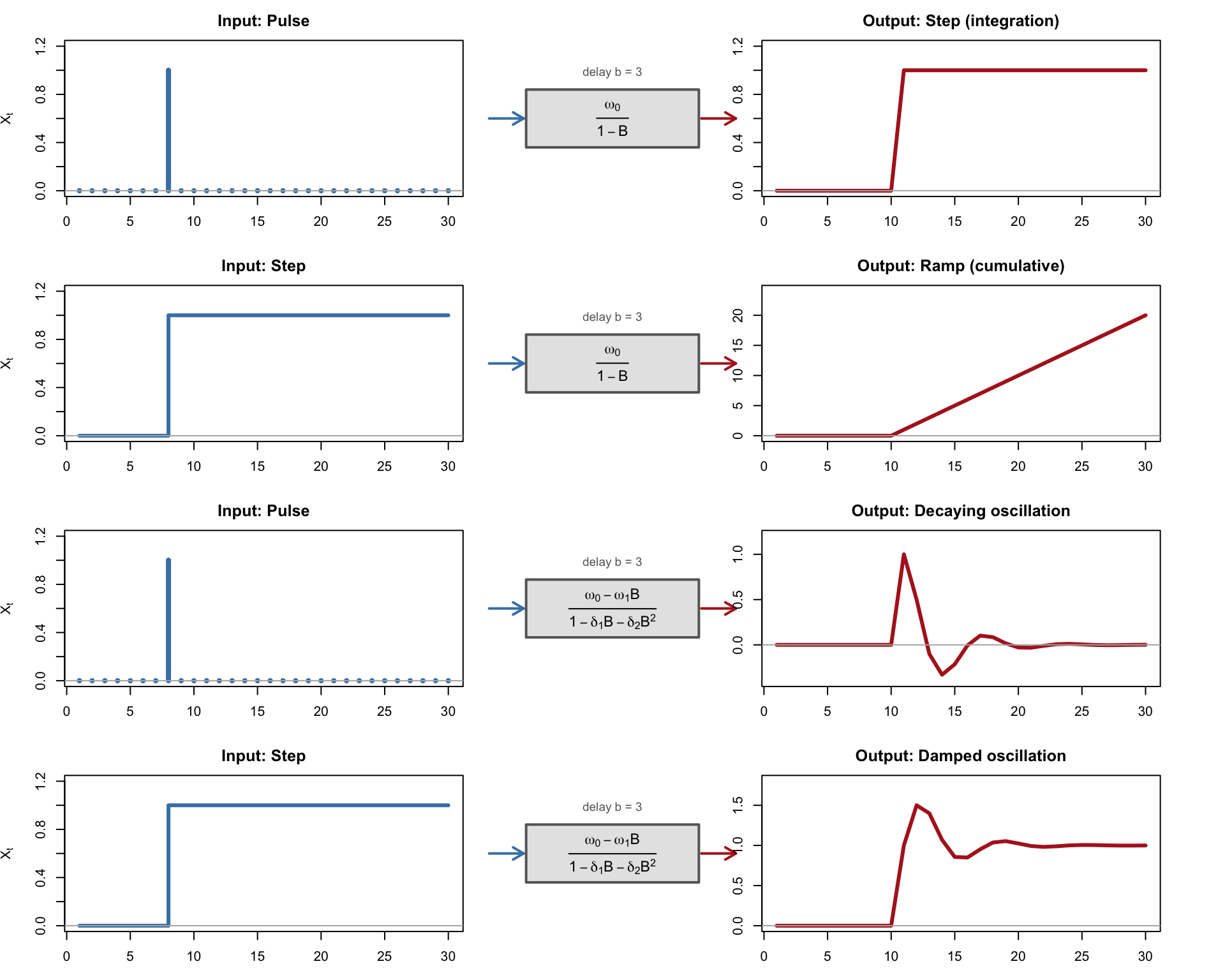 # Layout: 4 rows (2 per case) x 3 columnslayout(matrix(1:12, nrow =4, ncol =3, byrow =TRUE),widths =c(3, 1.8, 3))w0 <-1.0# ============================================================# Case 4: Integrating TF: v(B) = omega_0 / (1 - B)# ============================================================# Pulse -> step (integration)y <-rep(0, n)for (i in (T0 + b):n) y[i] <- w0draw_irf_row(t, pulse, y, "Pulse",expression(frac(omega[0], 1- B)),"Step (integration)", "h", "l", b)# Step -> ramp (cumulative)y <-rep(0, n)for (i in (T0 + b):n) y[i] <- w0 * (i - T0 - b +1)draw_irf_row(t, step, y, "Step",expression(frac(omega[0], 1- B)),"Ramp (cumulative)", "s", "l", b)# ============================================================# Case 5: TF(r=2, s=1, b) with complex roots: oscillatory# ============================================================# (w0 - w1 B) / (1 - d1 B - d2 B^2) with complex rootsd1_osc <-0.8d2_osc <--0.5w1_osc <-0.3# Pulse -> damped oscillationy <-rep(0, n)# Build impulse response weights firstv <-rep(0, n)v[1] <- w0v[2] <- d1_osc * v[1] - w1_oscfor (i in3:n) v[i] <- d1_osc * v[i-1] + d2_osc * v[i-2]# Assign impulse-response weights for pulse responsefor (i in (T0 + b):n) { idx <- i - T0 - b +1 y[i] <- v[idx]}draw_irf_row(t, pulse, y, "Pulse",expression(frac(omega[0] - omega[1]*B,1- delta[1]*B - delta[2]*B^2)),"Decaying oscillation", "h", "l", b)# Step -> damped oscillationy <-rep(0, n)for (i in (T0 + b):n) { idx <- i - T0 - b +1 y[i] <-sum(v[1:idx])}draw_irf_row(t, step, y, "Step",expression(frac(omega[0] - omega[1]*B,1- delta[1]*B - delta[2]*B^2)),"Damped oscillation", "s", "l", b)layout(1)