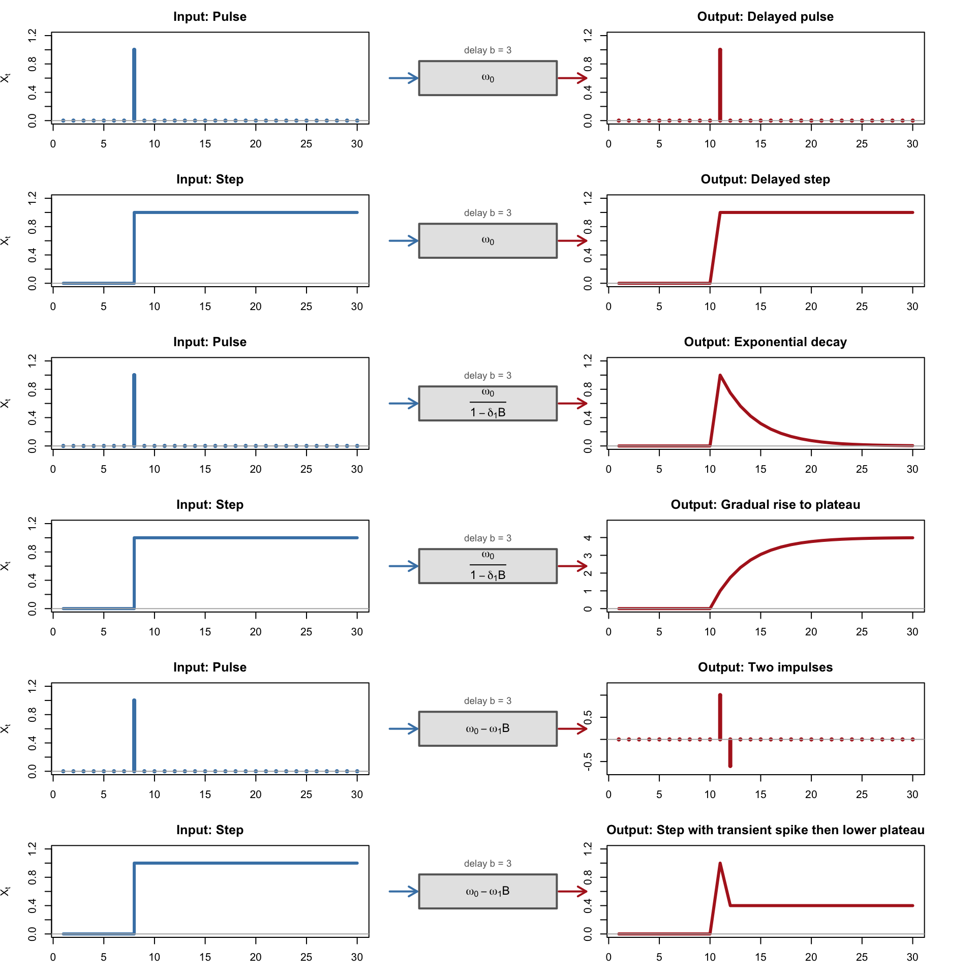 # Layout: 6 rows (2 per case) x 3 columnslayout(matrix(1:18, nrow =6, ncol =3, byrow =TRUE),widths =c(3, 1.8, 3))# ============================================================# Case 1: TF(r=0, s=0, b): v(B) = omega_0 (simple gain)# ============================================================w0 <-1.0# Pulse -> delayed pulsey <-rep(0, n)y[T0 + b] <- w0draw_irf_row(t, pulse, y, "Pulse", expression(omega[0]),"Delayed pulse", "h", "h", b)# Step -> delayed stepy <-rep(0, n)y[t >= (T0 + b)] <- w0draw_irf_row(t, step, y, "Step", expression(omega[0]),"Delayed step", "s", "l", b)# ============================================================# Case 2: TF(r=1, s=0, b): v(B) = omega_0 / (1 - delta_1 B)# ============================================================d1 <-0.75# Pulse -> exponential decayy <-rep(0, n)start <- T0 + bfor (i in start:n) y[i] <- w0 * d1^(i - start)draw_irf_row(t, pulse, y, "Pulse",expression(frac(omega[0], 1- delta[1]*B)),"Exponential decay", "h", "l", b)# Step -> gradual rise to plateauy <-rep(0, n)for (i in start:n) y[i] <- w0 * (1- d1^(i - start +1)) / (1- d1)draw_irf_row(t, step, y, "Step",expression(frac(omega[0], 1- delta[1]*B)),"Gradual rise to plateau", "s", "l", b)# ============================================================# Case 3: TF(r=0, s=1, b): v(B) = omega_0 - omega_1 B# ============================================================w1 <-0.6# Pulse -> two consecutive impulsesy <-rep(0, n)y[T0 + b] <- w0y[T0 + b +1] <--w1draw_irf_row(t, pulse, y, "Pulse",expression(omega[0] - omega[1]*B),"Two impulses", "h", "h", b)# Step -> transient spike then lower plateauy <-rep(0, n)y[T0 + b] <- w0for (i in (T0 + b +1):n) y[i] <- w0 - w1draw_irf_row(t, step, y, "Step",expression(omega[0] - omega[1]*B),"Step with transient spike then lower plateau", "s", "l", b)layout(1)