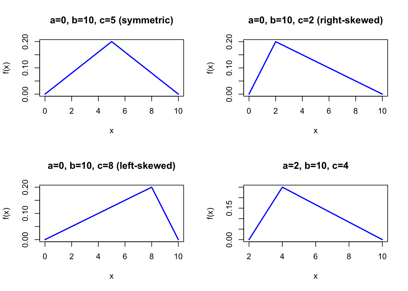 dtriangular <-function(x, a, b, c) {ifelse(x < a | x > b, 0,ifelse(x <= c,2* (x - a) / ((b - a) * (c - a)),2* (b - x) / ((b - a) * (b - c))))}par(mfrow =c(2, 2))x <-seq(0, 10, length =500)plot(x, dtriangular(x, 0, 10, 5), type ="l", lwd =2, col ="blue",xlab ="x", ylab ="f(x)", main ="a=0, b=10, c=5 (symmetric)")plot(x, dtriangular(x, 0, 10, 2), type ="l", lwd =2, col ="blue",xlab ="x", ylab ="f(x)", main ="a=0, b=10, c=2 (right-skewed)")plot(x, dtriangular(x, 0, 10, 8), type ="l", lwd =2, col ="blue",xlab ="x", ylab ="f(x)", main ="a=0, b=10, c=8 (left-skewed)")x2 <-seq(2, 10, length =500)plot(x2, dtriangular(x2, 2, 10, 4), type ="l", lwd =2, col ="blue",xlab ="x", ylab ="f(x)", main ="a=2, b=10, c=4")par(mfrow =c(1, 1))