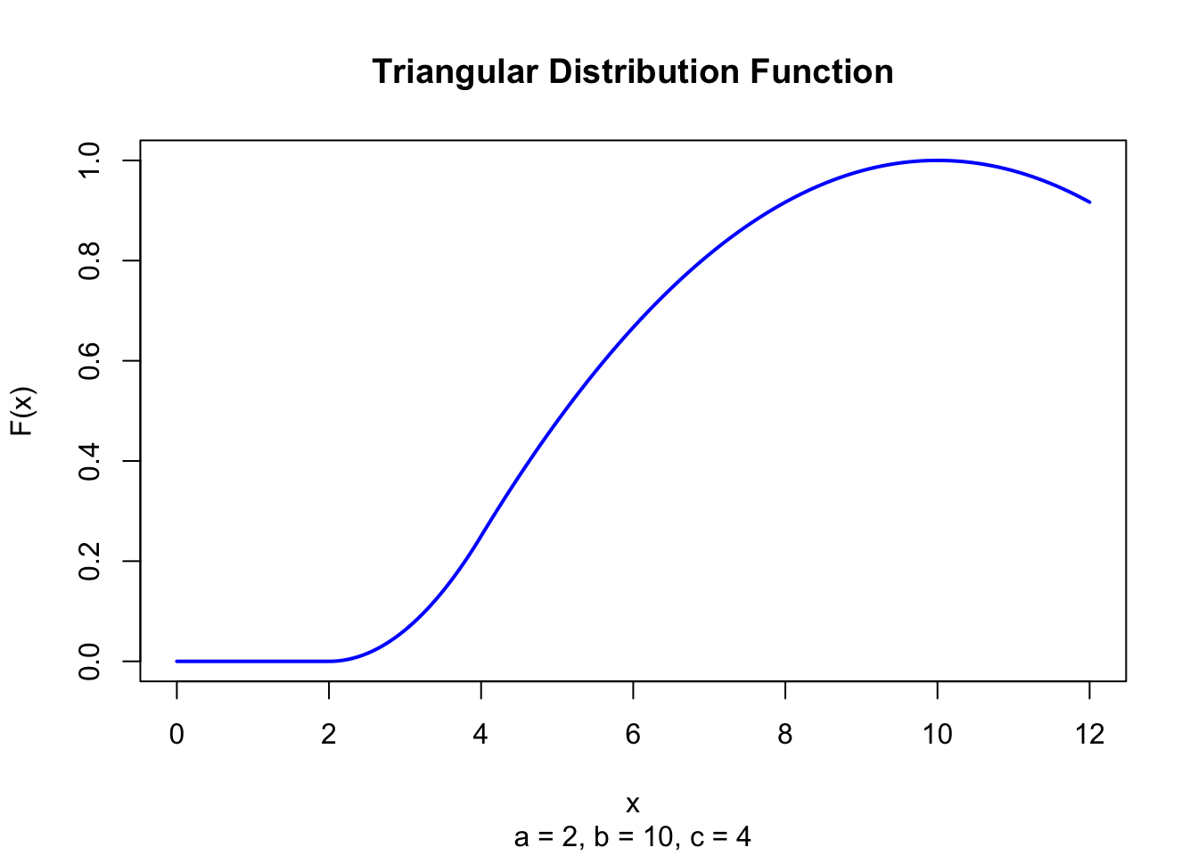 The figure below shows the Triangular Distribution Function for \(a = 2\), \(b = 10\), \(c = 4\).