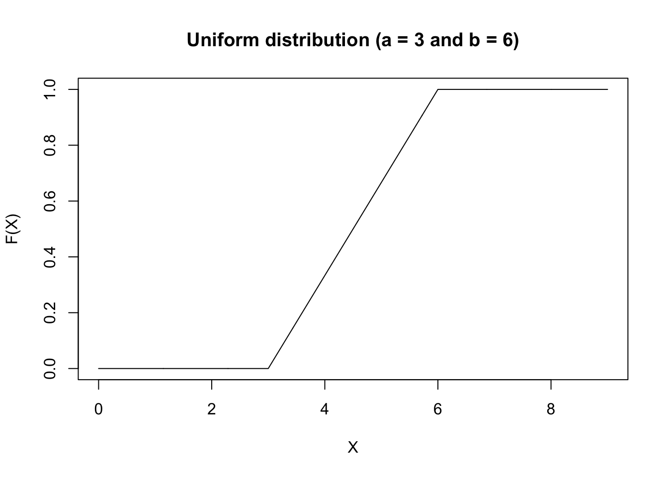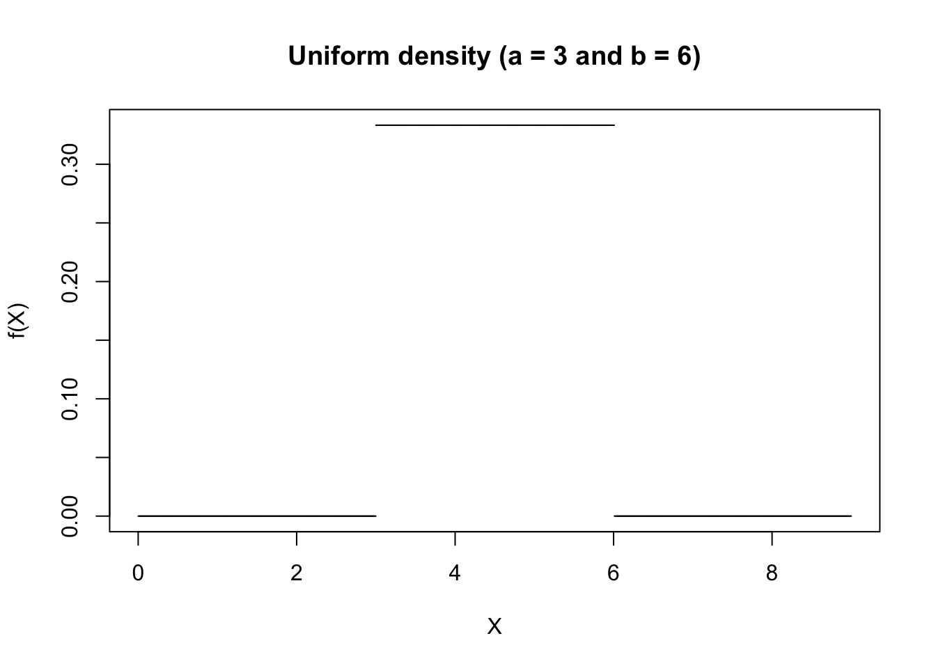 plot(x,hx,type="n",xlab="X", ylab="f(X)", xlim=c(0,9), main="Uniform density (a = 3 and b = 6)")